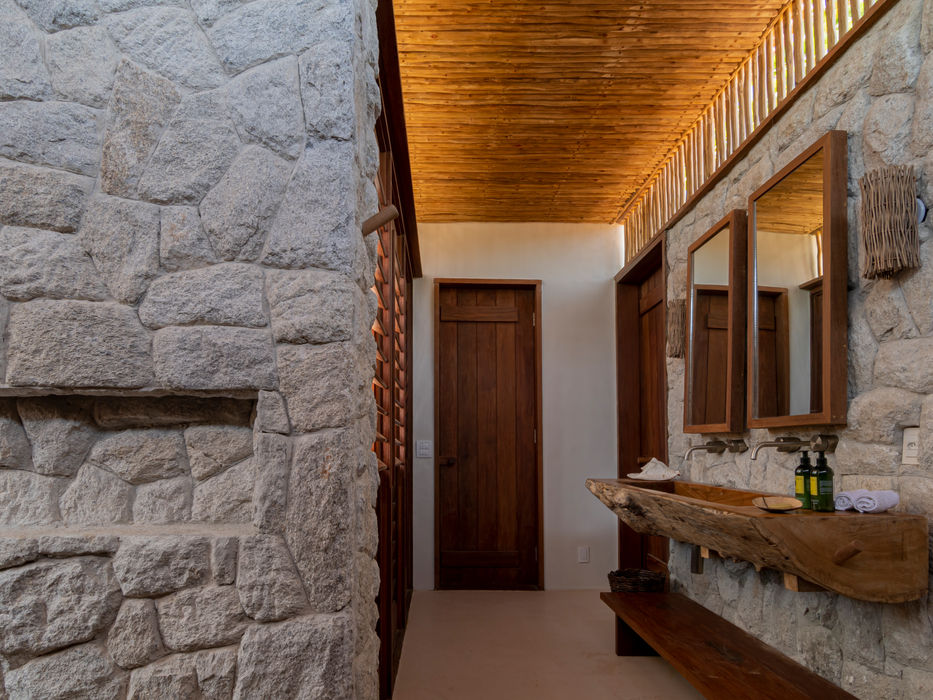 O jardim privativo completa a experiência com hidromassagem, ducha, rede e sofá, criando um cenário perfeito para relaxar e sentir a brisa do mar. Um espaço que equilibra conforto, elegância e conexão com a natureza de Jeri.